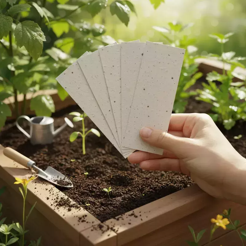 Nuestras tarjetas plantables personalizadas son la solución ideal. Estas tarjetas no solo transmiten tu mensaje, sino que también permiten que tus clientes planten y hagan crecer verduras u hortalizas, generando un impacto positivo en el medio ambiente.