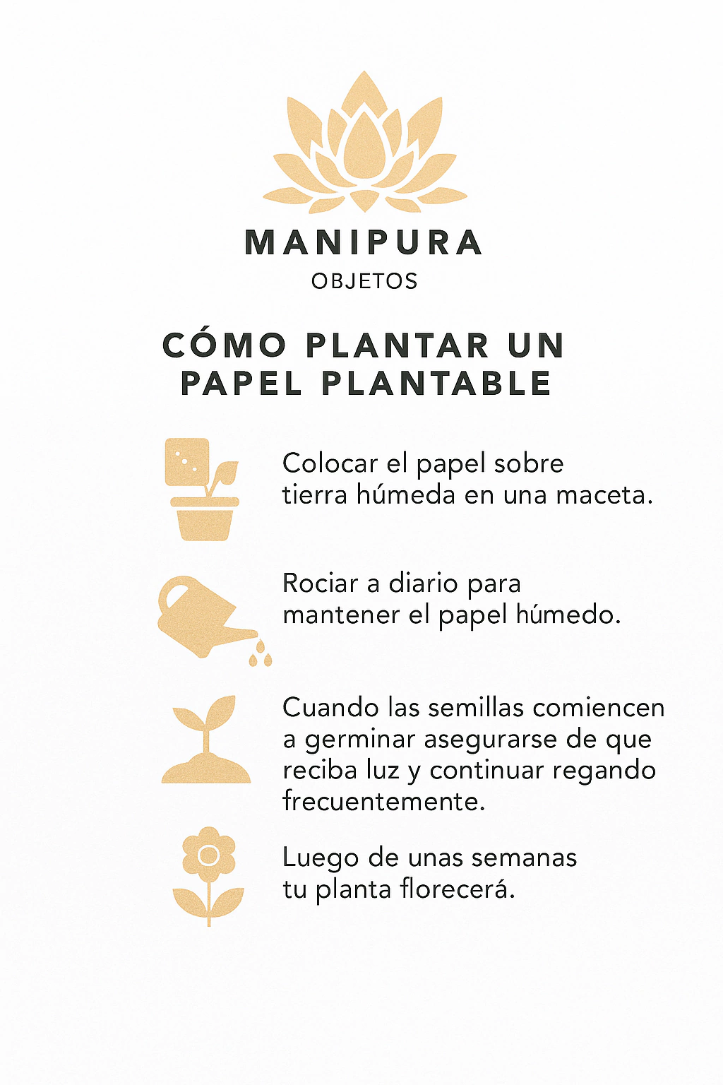 INFO DEL PRODUCTO - MATERIAL: Papel plantable de alta calidad. - MEDIDAS: Disponibles en diversas dimensiones para satisfacer tus requerimientos. - USO SOSTENIBLE: Ideal para empresas que desean dar un paso hacia la sostenibilidad y el cuidado del medio ambiente. - IMPRESIÓN: Personalizamos según tu diseño, asegurando que tu marca se destaque.